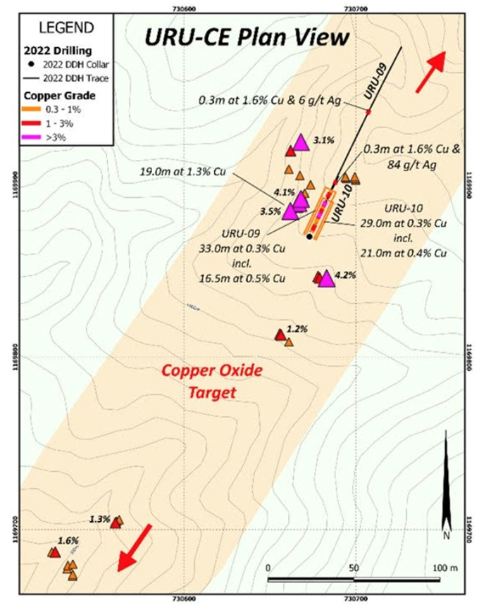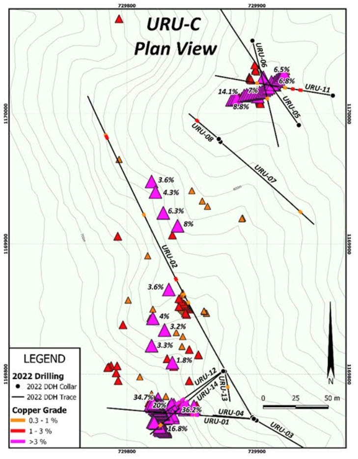 URU-1 and 14 both had significant intercepts, with URU-1 returning 7.0m of 1.4% copper + 8 g/t silver, while URU-14 intersected 12.5m of 1.2% copper + 18 g/t silver, with a higher-grade 5.8m of 2.1% copper + 46 g/t silver.