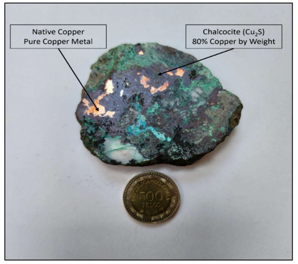 Native copper and chalcocite are the primary copper-bearing minerals observed in the outcrops. These minerals indicate the depositional environment was sulfur-poor, leading to the precipitation of these high-grade copper minerals.