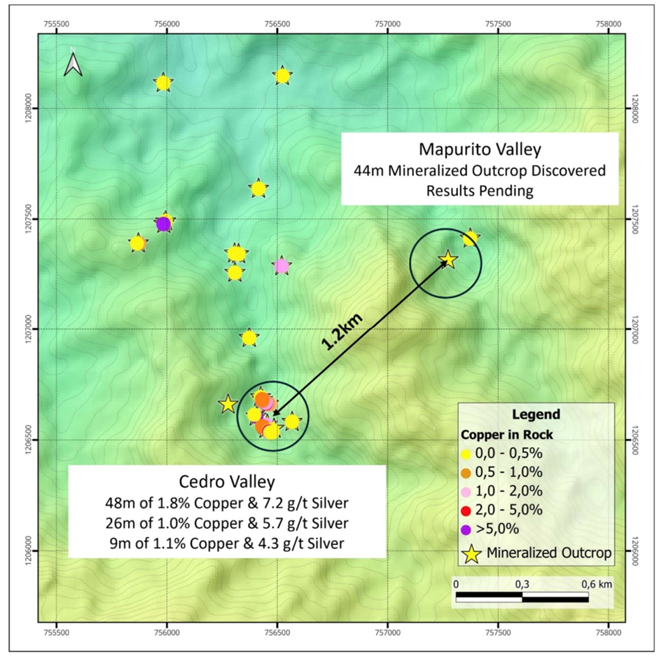 “The 48.0m width at 1.8% copper at Cedro Valley is quite remarkable and the discovery of a 44.0m outcrop of similar mineralization in Mapurito valley 1.2 km to the northeast speaks to the target’s potential to be a world-class deposit.”