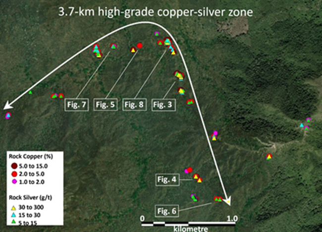 Assays from one of the target zones were also released at the time, with highlight values ranging from 5.9% to 14.8% Cu and 19 g/t to 132 g/t Ag.