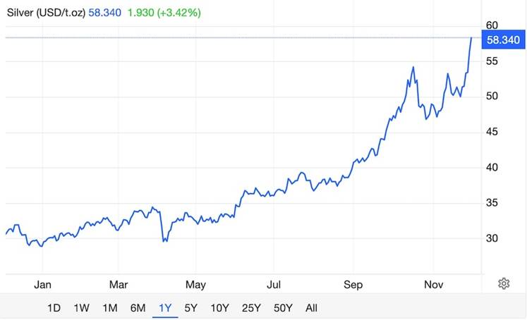 Silver’s combination of monetary and industrial demand, along with tight supply conditions, is driving the metal to fresh heights. As mentioned at the top, silver scaled $59 on Monday for the first time ever, extending Friday’s record $56.