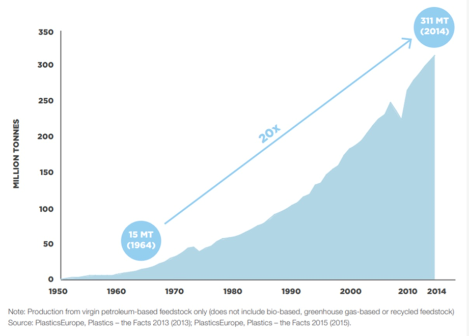 A 2016 study by the World Economic Forum estimates that global plastic production went from 15 million tonnes in 1964 to 311 million tonnes in 2014 — a 20-fold increase during a 50-year period. Now, the world produces more than 380 million tonnes of plastic, up to 50% of which are for single use.