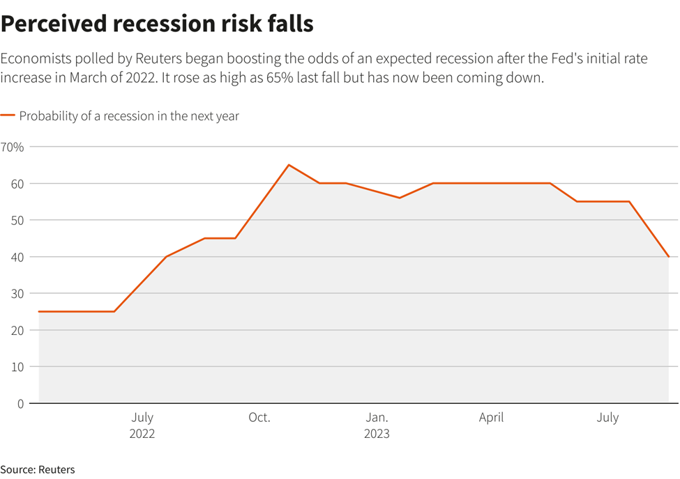 A recent Reuters poll of economists over the past year showed the risk of a recession one year out rising from 25% in April 2022, the month after the first rate hike of the Fed’s current tightening cycle, to 65% in October. The most recent read is 55%.