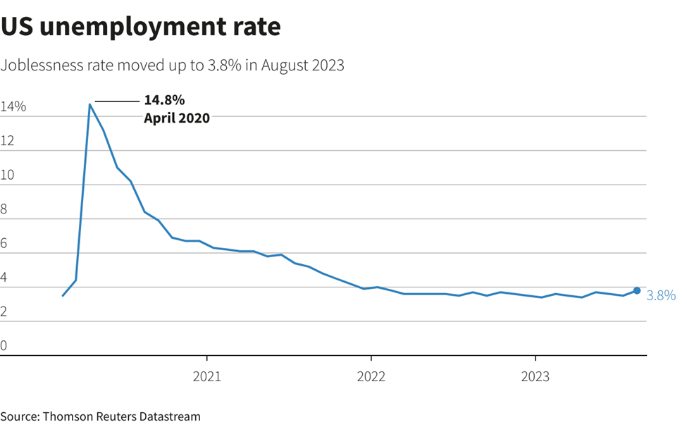 Job growth also picked up in August, while the unemployment rate rose to 3.8% and wage gains moderated, suggesting that labor market conditions were easing after hitting their peak.