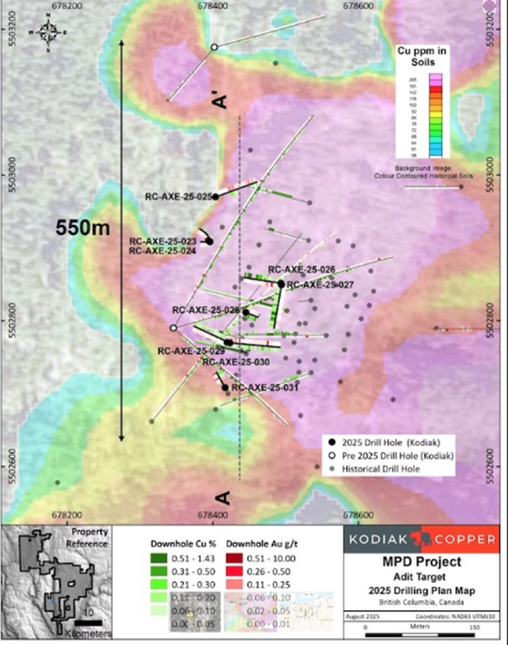 On June 18 Kodiak Copper announced its fully-funded 2025 exploration program at MPD will involve drilling approximately 5,500 meters at West, Adit and South. A total of 39 drill holes were proposed.