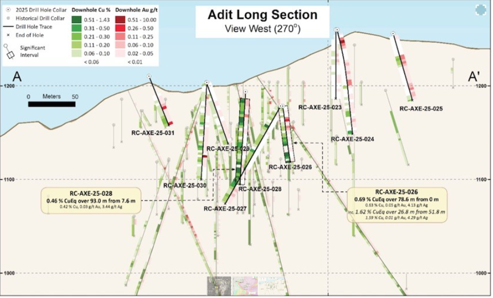 According to the company, drilling at the Adit Zone has intersected mineralization over a strike length of approximately 550 meters and the zone remains open in multiple directions.