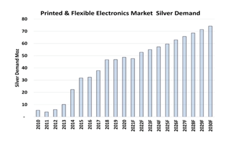 Finally, silver demand for “printed and flexible electronics” is forecast to increase 54% over the next nine years, rising from 48Moz in 2021 to 74Moz in 2030, meaning a consumption of 615Moz during this time frame.
