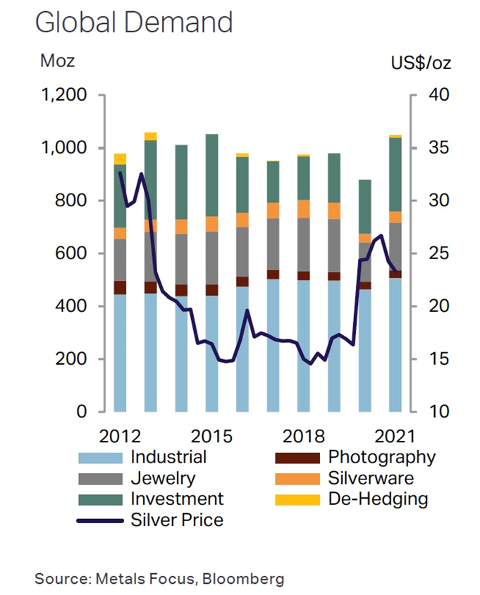 Despite the prolonged worldwide chip shortage, the outlook for silver demand in automotive and 5G related applications remains robust this year. The former has been underpinned by increasing vehicle electrification, which leads to higher silver loadings per vehicle. Meanwhile, the latter has been assisted by the acceleration of building infrastructure to support 5G networks and strong demand from mobile devices.