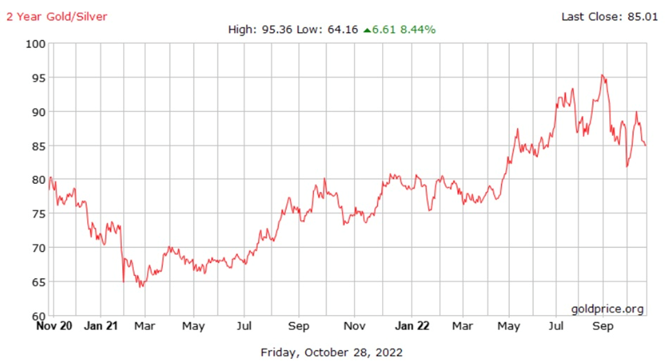 As the chart below shows, the gold-silver ratio over the past two years has been all over the map, reaching a low of 64.16 in March, 2021, and hitting a high of 95.36 in September, 2022.