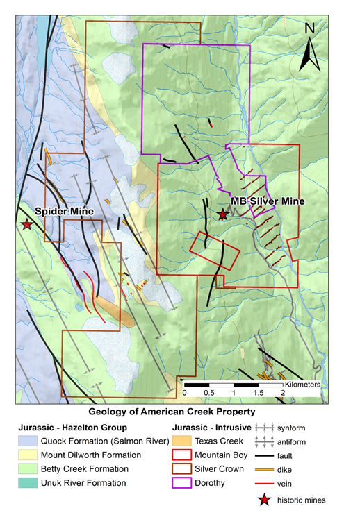 There is abundant evidence pointing to large, continuous regional and property scale faults, folds and shear zones, which are often related to mineralization in the region. Significant alteration and mineralization have already been observed along these structures forming the American Creek corridor.
