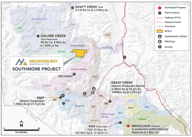 The completed portion of the Galore Creek access road is within 12 km of the Southmore project. Further to the southeast lies the historic Eskay Creek mine, some 40 km away from Southmore (see map below).