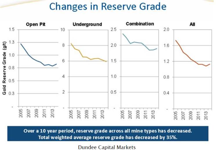 It’s not surprising that gold companies are finding it tougher to add to reserves. The fact is, all of the easy, low-hanging fruit has been picked. Even with a six-fold increase in exploration spending between 2002 and 2012, there has been a significant dearth of new discoveries.