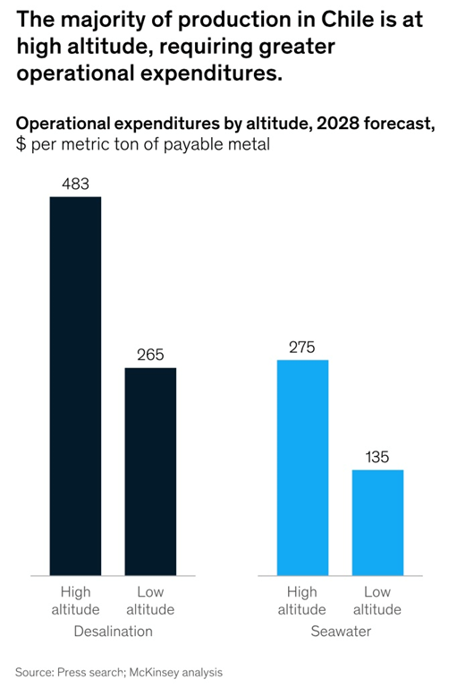 Chile’s mines are not only “high and dry”, requiring expensive desalination plants with pipelines running hundreds of kilometers inland and uphill, most of them are seeing lower grades, requiring more water to produce the same amount of copper that was previously mined at higher grades. In other words, the economics are becoming challenging.