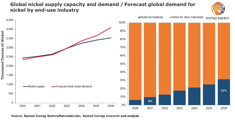 A more conservative estimate from Rystad Energy shows that demand for high-grade nickel used in EV batteries will outstrip supply by 2024. By then, global demand will climb to 3.4Mt, compared to 2.5Mt this year, while supply will grow to 3.2Mt.
