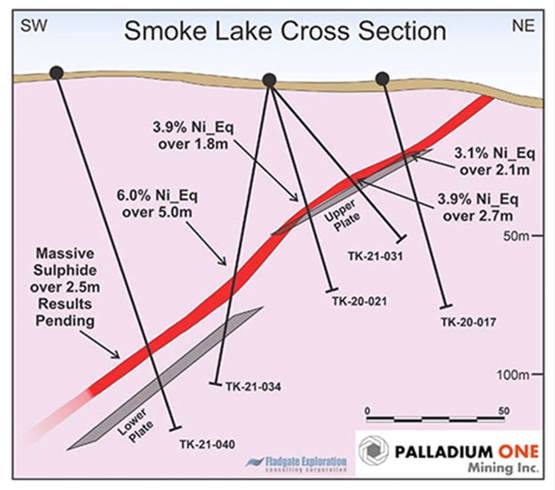 “Smoke Lake continues to deliver exceptional nickel grades. These results, notably hole TK21-034 indicate that the upper and lower plates are in fact one continuous sulphide lens. Additionally, evidence exists that the high-grade mineralization has been remobilized, thus seeking the source of mineralization is our top priority,” Palladium One’s President and CEO Derrick Weyrauch stated in the June 17 news release.