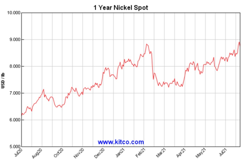 However, the nickel market is currently under-supplied in relation to demand, a condition that is supporting higher prices. Spot nickel currently sits at $8.82/lb, the highest since February and a 20% increase since April. Nickel earlier this year reached a six-year pinnacle.