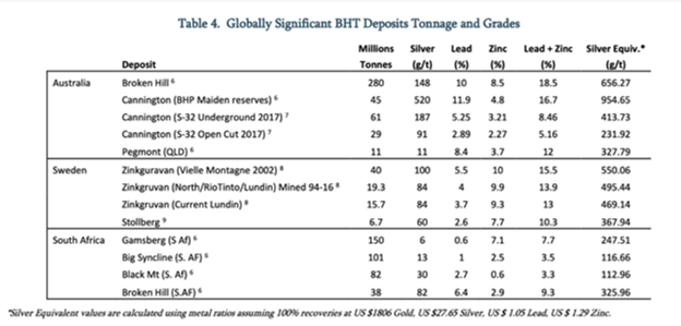 BHT silver-zinc-lead deposits constitute some of the largest and highest-grade ore deposits in the world (see Table 4 below). The namesake deposit, Broken Hill in New South Wales, Australia, represents the largest accumulation of lead, zinc and silver on Earth. Broken Hill Types constitute a distinctive type of stratiform, sediment hosted lead-zinc mineral deposit. They are distinguished from other silver-zinc-lead deposits by the chemistry of the sediment that hosts them, and they are usually associated spatially and temporally with volcanism.