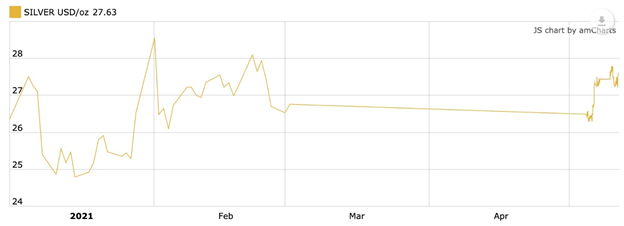 In late January silver kicked higher after a Reddit WallStreetBets subpost triggered a call to buy. A flurry of purchases saw silver blow past $28 and touch $31 briefly, before falling back. Since March, the white metal has been trading in a fairly tight range between $26 and $28.