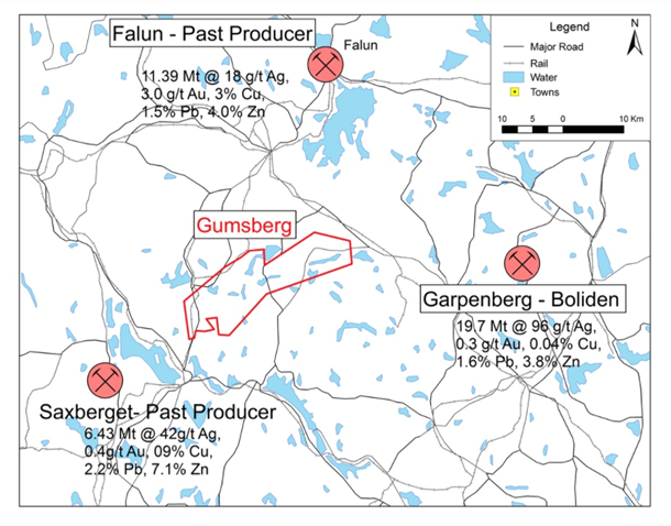 The project is located within the Bergslagen mining district, between the past-producing Falun and Saxberget mines, and the active Garpenberg (Boliden) and Zinkgruvan (Lundin) mines.