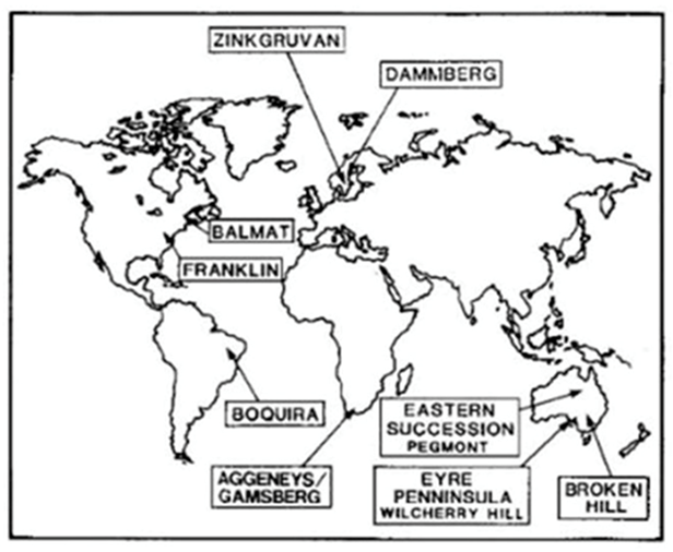 Examples of the calc-silicate type are the Broken Hill mine in Australia, Zinkgruvan in the Bergslagen mining district of Sweden, currently being mined by Lundin, and the Franklin zinc-iron-manganese deposit in New Jersey, USA.