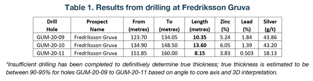 The three holes drilled earlier this year at Fredriksson Gruva delineated up to 13.60 meters of 6.05% zinc, 1.39% lead and 43.20 grams per tonne (g/t) silver, confirming the prospect’s potential for expansion.