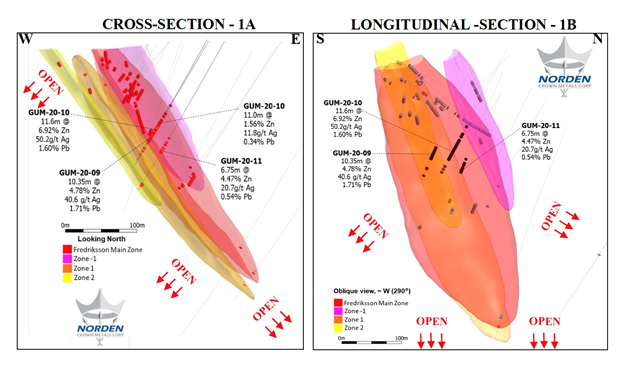 A cross-section (looking north 1A) and a longitudinal section (looking west 1B) showing the stacked silver-zinc-lead mineralization at Fredriksson Gruva and key intercepts from Norden Crown’s initial drilling in March (see NOCR news release dated March 1, 2021).