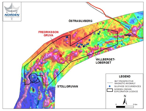 “Surface exploration work at Gumsberg will focus on expanding the current footprint of silver-rich base metals mineralization at Fredriksson Gruva,” said Norden Crown’s President and CEO Patricio Varas, in the July 26 news release. “Broken Hill Type deposits have the potential to yield large tonnages from comparatively small drill footprints due to the high density of the mineralization, so we are conducting detailed geological mapping and tightly spaced airborne magnetic geophysics to delineate mineralization in advance of additional diamond drilling.”
