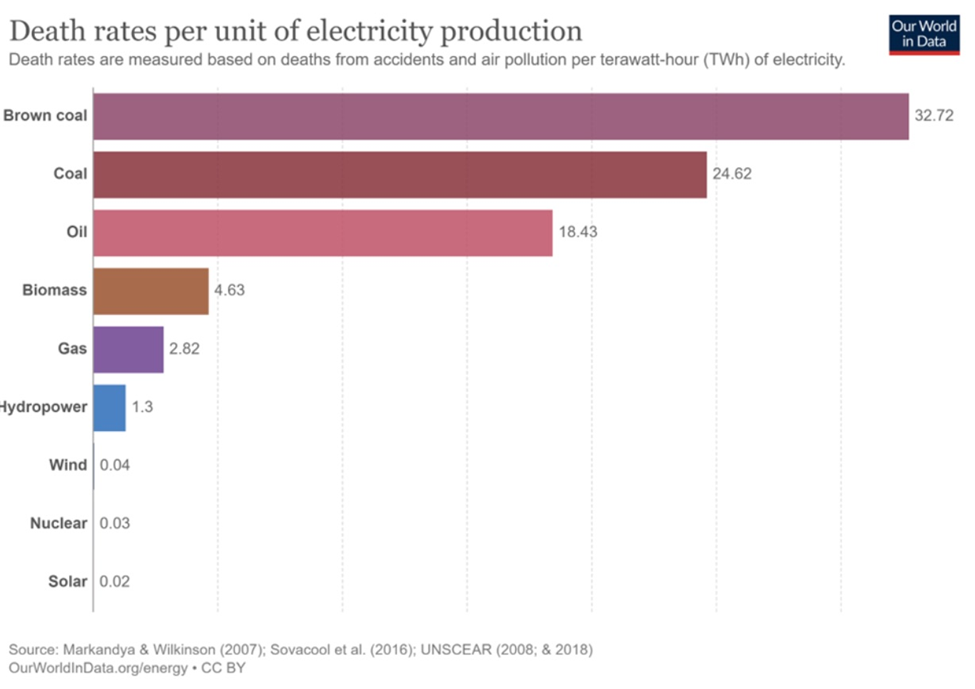Energy for Humanity states that, Whilst air pollution from fossil fuels is responsible for an estimated 7 million deaths per year, nuclear carries about the same risk as wind power and is around 350 times safer than coal.