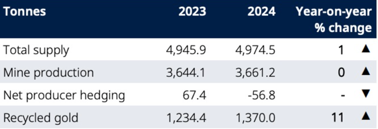 The latest full-year World Gold Council report shows a 1% increase in total gold supply in 2024, compared to 2023, 4,974.5 tonnes versus 4,945.9t. In fact, gold supply in 2024 surpassed the record reached in 2018.