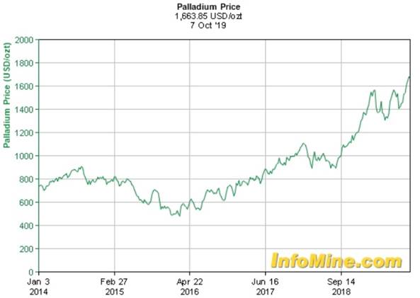 In contrast, palladium has more than doubled over the last three years (+124%) and ran up 18% in 2018. Spot palladium raced past US$1,700 an ounce in September, and traded at $1,663/oz on October 7, far outpacing spot gold, which finished Monday at $1,492/oz.