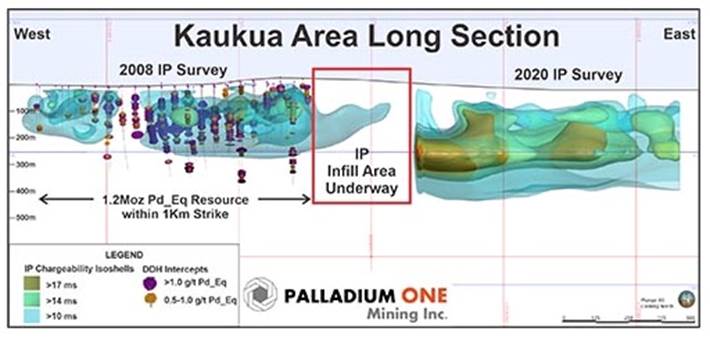 A previous IP survey worked well in identifying the core of the Kaukua deposit, which hosts 1.2 million Pd_eq ounces and has a strike length of one kilometer.