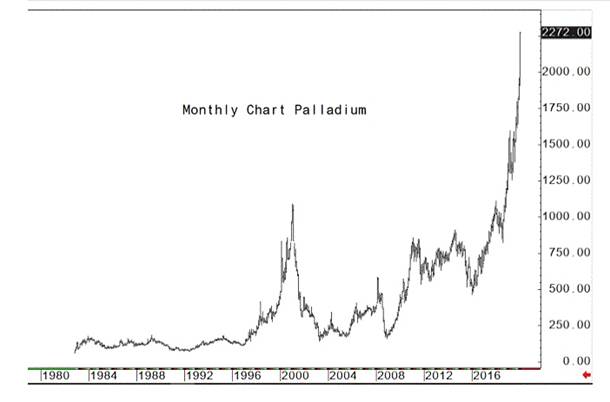 Spot palladium ran nearly 10% to $2,539 an ounce, continuing over a week of straight gains that has commodity traders saying the platinum-group metal has “gone parabolic”, meaning the chart pattern, shown below, shows prices rising with an increasingly steeper slope.