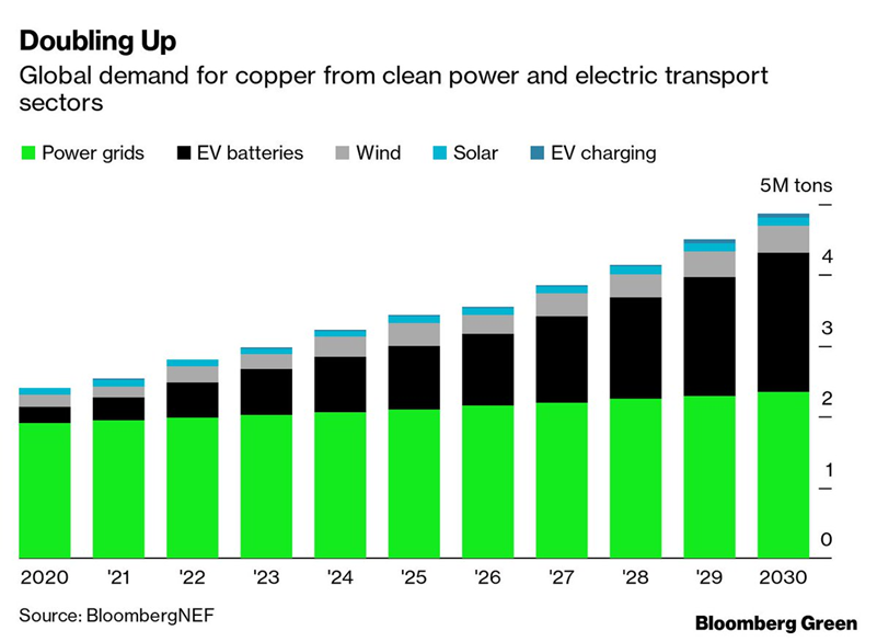 In 20 years, BloombergNEF predicts that global copper production must double to meet the demand for a 30% penetration rate of electric vehicles — from the current 20 million tonnes a year to 40 million tonnes.