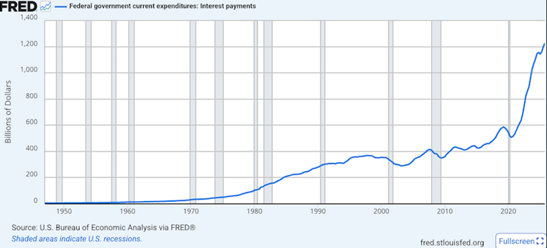 America reportedly borrowed $43.5 billion a week in the first four months of the fiscal year, which starts in October. The interest on that debt works out to over $1 trillion for 2026. Interest in 2024 and 2025 also exceeded $1 trillion.