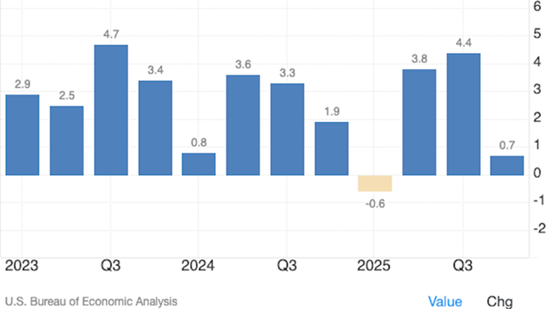 According to Trading Economics, the US economy expanded an annualized 0.7% in the fourth quarter of 2025, the weakest performance since the economy contracted in Q1 of last year, and well below expectation of 1.4% growth.