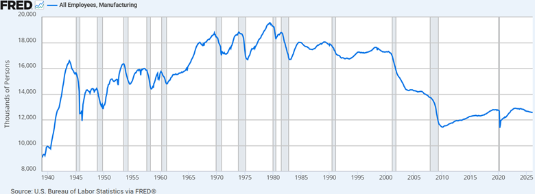 US manufacturing employment continues to shrink, with the sector losing another 12,000 jobs in February, to 12.57 million, the lowest since January 2022.
