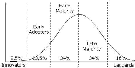 In 1962, Everett Rogers, a professor of rural sociology, published his seminal work: Diffusion of Innovations. Rogers theory seeks to explain how new ideas/technologies are adapted. The chart above shows the stages of consumer adoption.
