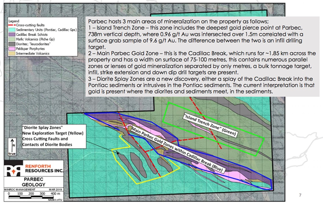 Renforth says These holes also confirm that there is a highly prospective gold bearing package at Parbec located within the sediments, outside of the Cadillac Break and its mineralized lenses, which requires additional follow up work.