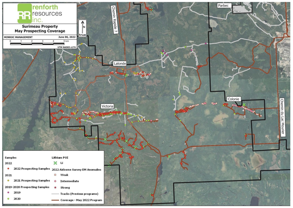 “Our first round of prospecting our district-scale Surimeau property this year went very well, our EM [electromagnetic] survey is proving to be an excellent road map to mineralization,” said Nicole Brewster, Renforth’s president and CEO, in the June 9 news release. “Everything we are learning will be utilized in the next round of prospecting at Surimeau and, eventually, our next drill program. We have new targets for the next round, based on what we learned this round, which we will target as we continue to learn about and develop Surimeau, Quebec’s newest battery metals district.”