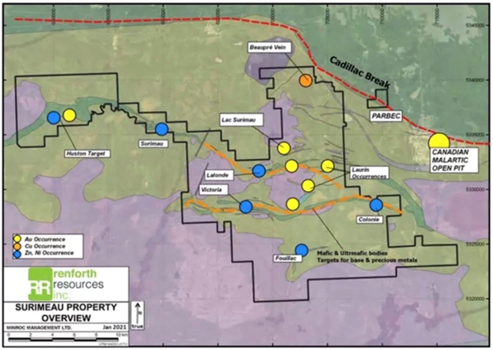 “These initial results validate the extent of surface mineralization on our Surimeau District Property. Our current interpretation is two separate polymetallic mineralized systems essentially running east/west, outcropping on surface, with lengths of ~20 km at Victoria and currently ~9km at Lalonde, the latter is still open on strike and unexplored. West of the Rapide 7 road the two horizons are separated north/south by ~3.7 km. Copper and Zinc mineralization is hosted in a thick sequence of greywacke with graphitic mudstone interlayers while Nickel and Cobalt mineralization is hosted within ultramafic flows,” said Renforth’s President & CEO Nicole Brewster, in the Sept. 26 news release. She continued: