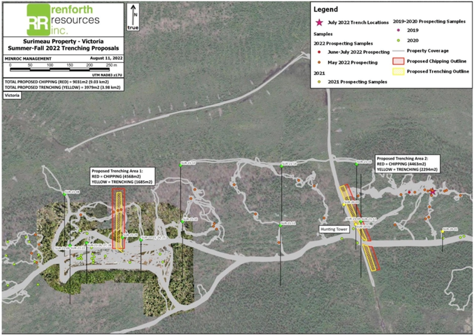 Channels were cut in each trench and samples sent for assay. Due to the success of this program, Renforth is now planning additional stripping to cross-cut the strike at Victoria, as well as a series of larger cross-cutting stripped trenches along the strike at Lalonde, to further define the extent of the mineralization.