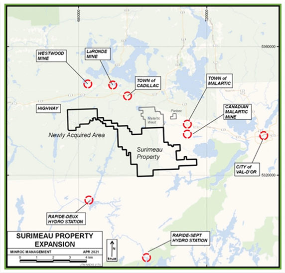 The 260 square-kilometer Surimeau property hosts several target areas for gold and industrial metals (nickel, copper, zinc, cobalt, silver) located south of the Cadillac Break, a major regional gold structure in Quebec.