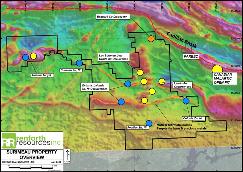 Renforth Resources’ (CSE:RFR, OTCQB:RFHRF, FSE:9RR) Surimeau project in Quebec is a district-scale property hosting several areas prospective for gold/silver and battery/industrial metals (nickel, copper, zinc, lead, cobalt, lithium and manganese). It is located south of the Cadillac Break, a major regional gold structure.