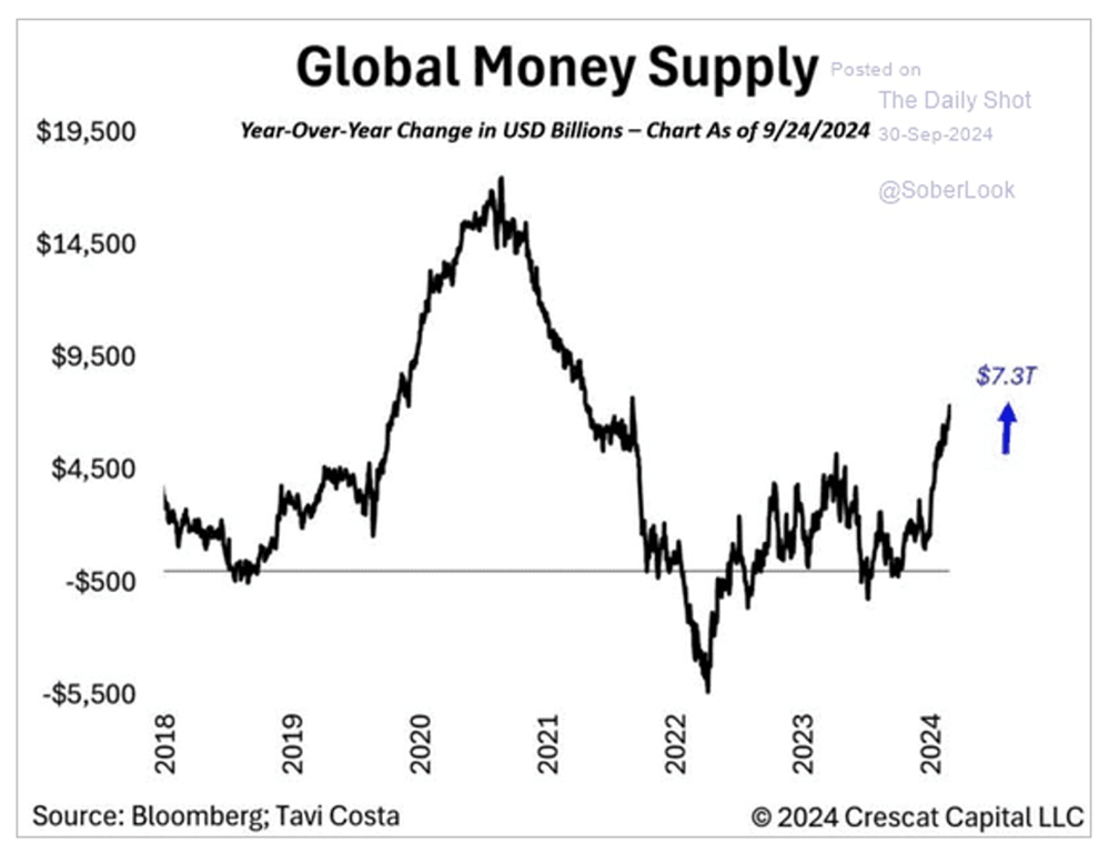 2024 is on track to be the second-strongest year of monetary inflows — money flowing into assets — since 2021. Central banks have increased the global money supply by $7.3 trillion, year on year.