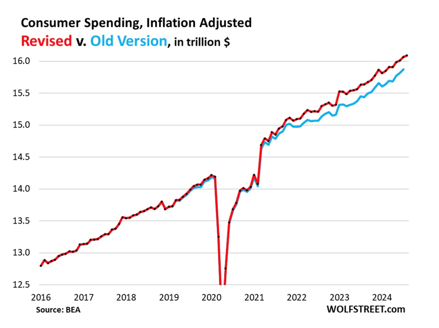 The last chart shows inflation-adjusted GDP for the second quarter was $305 billion higher than the old version. It indicates that GDP increased much faster between 2022 and 2024 than previously thought.
