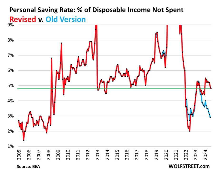 The second chart is disposable income adjusted for inflation. The revised version for August was +3.1% year over year, and the revised version for July was +3.2% year over year compared to the old version for July of 1.1%. Over the two years between July 2022 and July 2024, the revised version of disposable income adjusted for inflation was +8.5%, versus the old version of +5.5%.