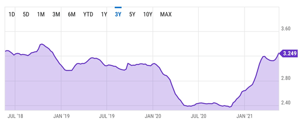 The pandemic has put tremendous pressure on supply chains, which in some cases, pose a threat to mining companies’ costs per tonne or ounce. For example the cost of diesel fuel has risen 22% year to date, to US$3.24 per gallon, the highest in three years.