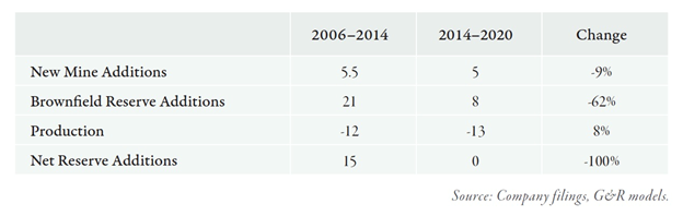 Between 2001 and 2014, 80% of new reserves came from re-classifying waste rock into mineable ore, ie., lowering the cut-off grade.
