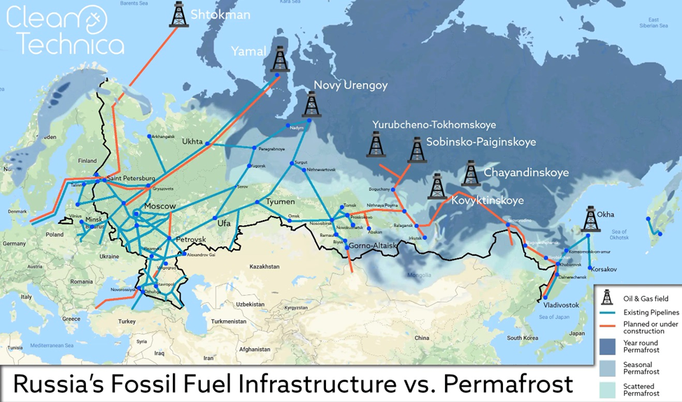 Think about what that could mean for mining and oil & gas extraction. Most of Russia’s oil and gas network is built on permafrost, and almost all of its oil & gas fields are under permafrost, as the map below by Clean Technica shows.