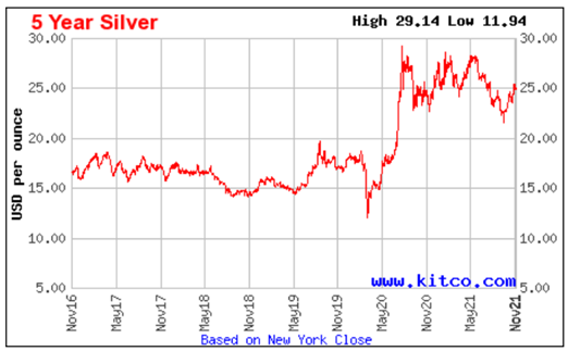 In fact silver prices have risen 28% year on year to Nov. 10, around the same percentage rise in 2020. “The upside reflects healthy investor inflows into silver, on the back of supportive macroeconomic conditions, notably the persistence of exceptionally low interest rates, concerns about uncontrolled fiscal expansion and, most recently, growing concerns about rising inflationary pressures,” states the Silver Institute.